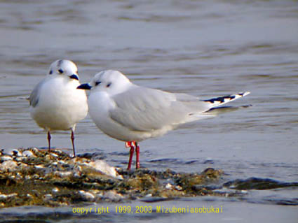 ユリカモメは嘴が細長くて赤く、夏羽の頭部は黒褐色、風切先端の黒色部は点状に切れないでつながっている。翼の下面の黒色部は広い。