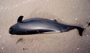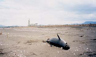 三百間の浜に打ち上げられたスナメリ、後ろはゴミ処理場